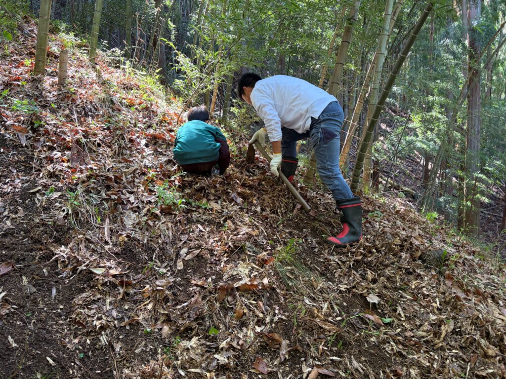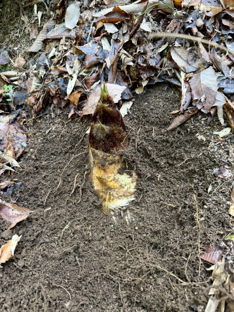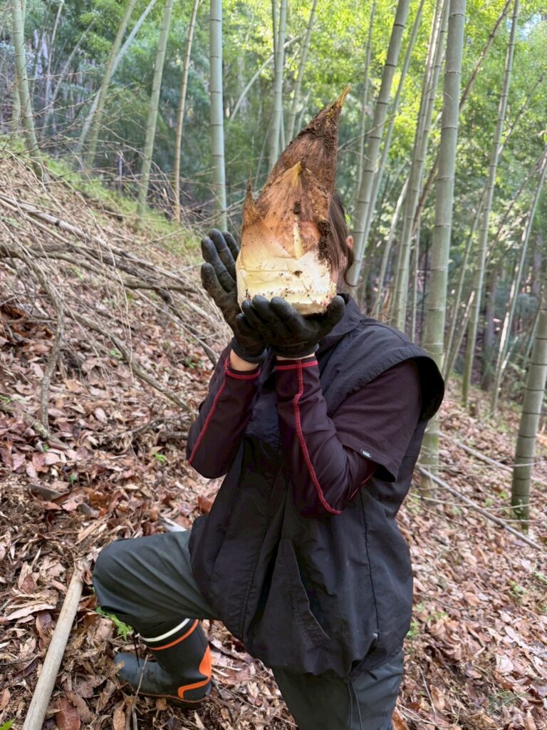 現地に到着すると、先ずはイッチャンからタケノコの掘り方のレクチャー。タケノコはただ掘ればいいわけではなく、周りの土を丁寧に掘りながら、傷つけないようにするのがポイント。最初は戸惑っていたメンバーも、次第にコツをつかみ、あちこちで「見つけた!」「大きい!」と歓声が上がっていました。